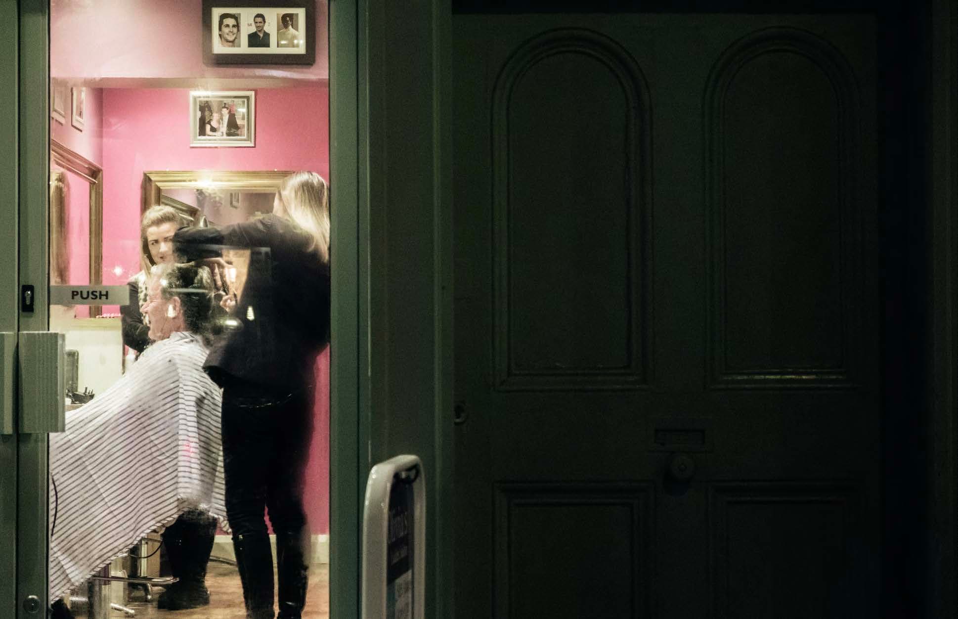 Une photo qui surprend par son cadre plus intimiste que la plupart des salons de coiffure. Ici, pas de vitres transparentes ni de néons blancs. Les deux coiffeuses s'occupent d'un client en discutant, dans une ambiance bon enfant. Et ça montre bien la dualité du métier : l'artisanat et l'aspect social.En l'occurrence, les deux coiffeuses sont plongées dans leur discussion, tandis que le client a les yeux rivés sur le miroir.