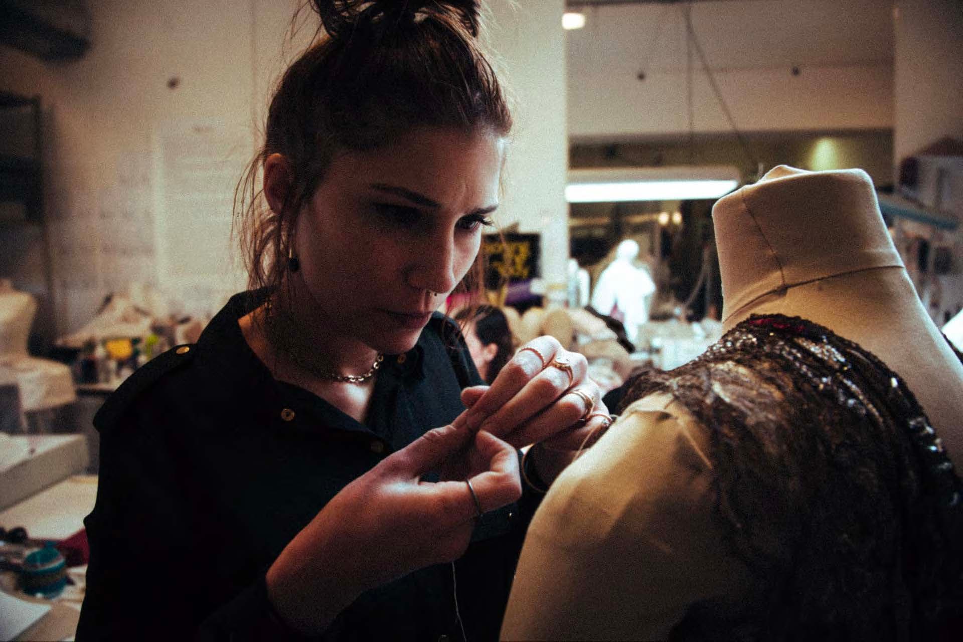 Fait surprenant pour Guillaume Mougin : la salle était immergée dans l'ombre, on avait du mal à distinguer les détails. Ce qui est d'autant plus surprenant vu la tâche minutieuse du métier. Autre point : le contraste entre le look décontracté de la couturière et la robe ultra-sophistiquée.