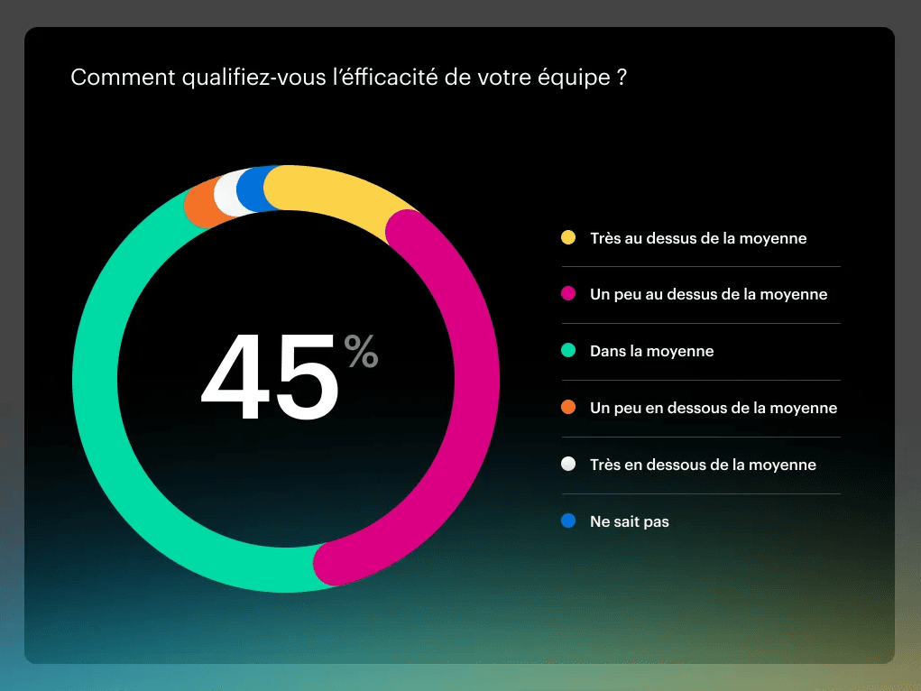 Ce qui signifie que 90% des salariés situent l'efficacité de leur équipe dans la moyenne, ou au-dessus. 6% seulement perçoivent leur équipe comme étant en dessous de la moyenne. Le reste (4%) réservent leur jugement.