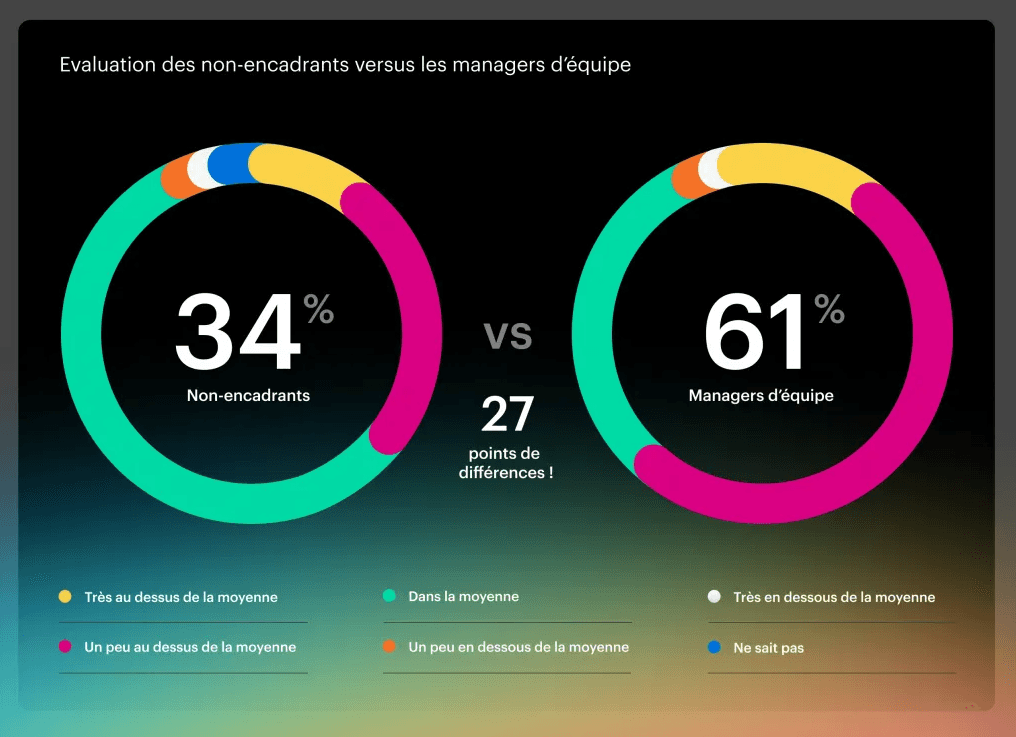 En effet, là où 34% des non encadrants juge l’efficacité de leur équipe au-dessus de la moyenne, les encadrants sont 61% à penser la même chose.