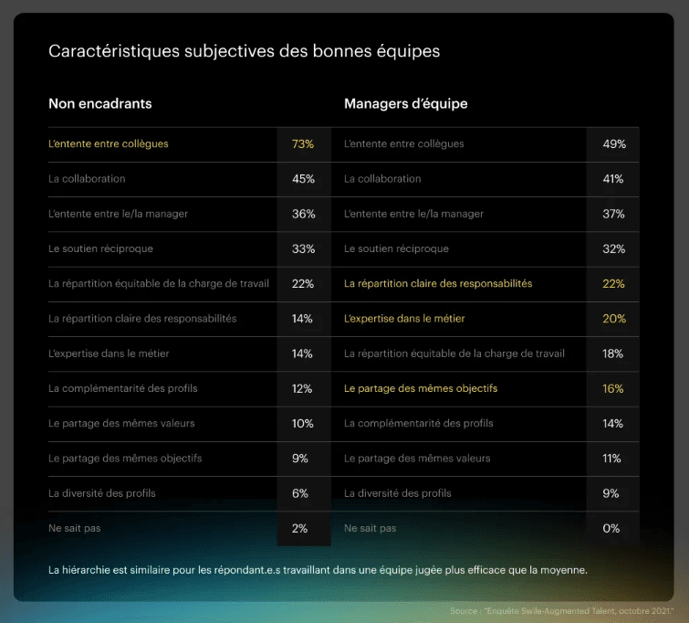 Le Top 3 des caractéristiques subjectives des bonnes équipes est identique pour les encadrants et les non encadrants. Nous nous attendions à ce que les managers / managés valorisent différemment les facteurs contribuant à l’efficacité des équipes.