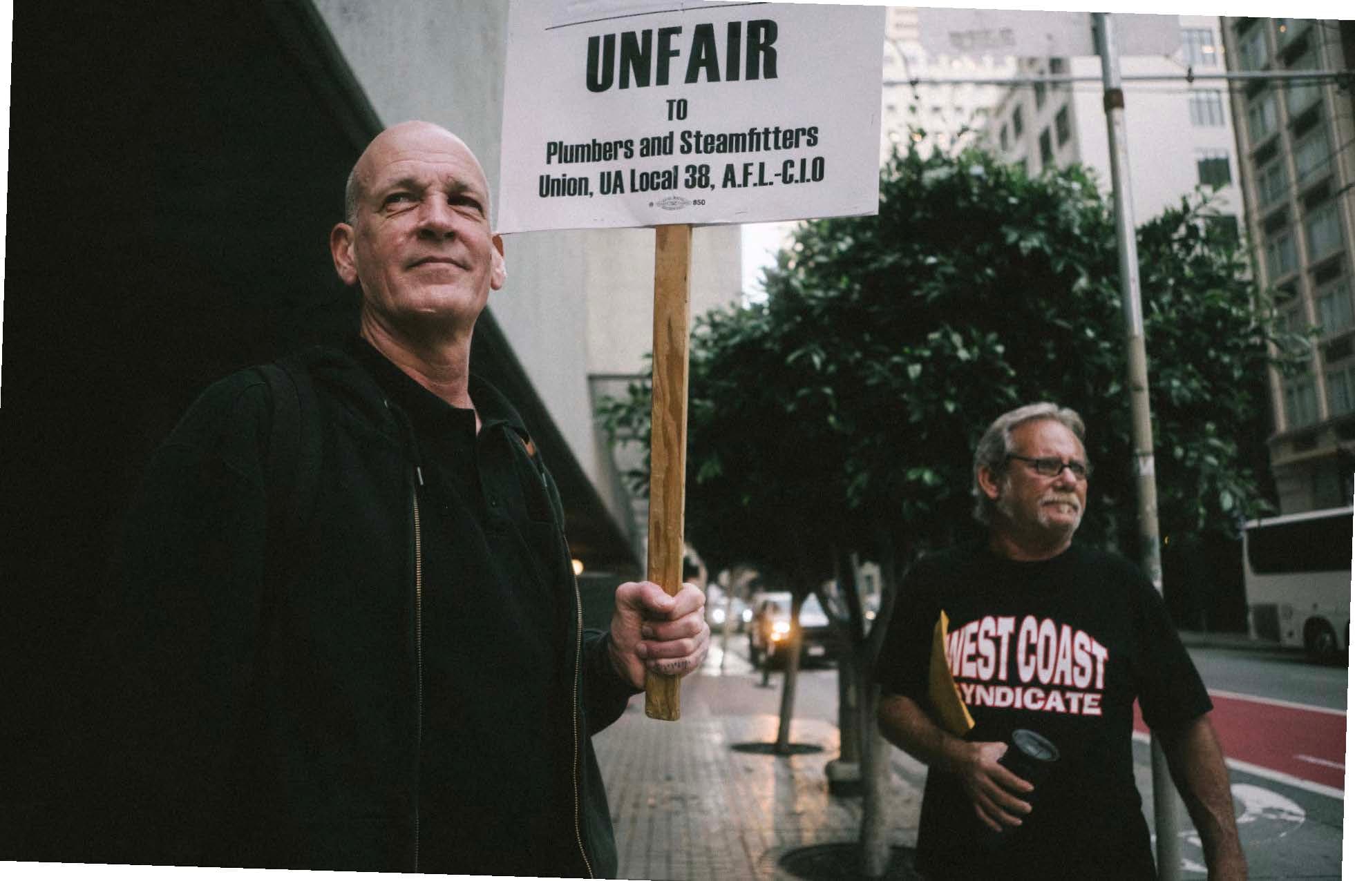 Une photo prise en plein centre de San Francisco, dans le quartier d'affaires d'Embarcadero. Guillaume Mougin résidait à l'hôtel juste à côté, et est tombé sur ce petit groupe en se levant de bonne heure. La raison derrière cette manif ? Encourager les plombiers de la ville à se syndicaliser, pour bénéficier de plein d'avantages sociaux : éducation, santé (un gros sujet aux États-Unis)...