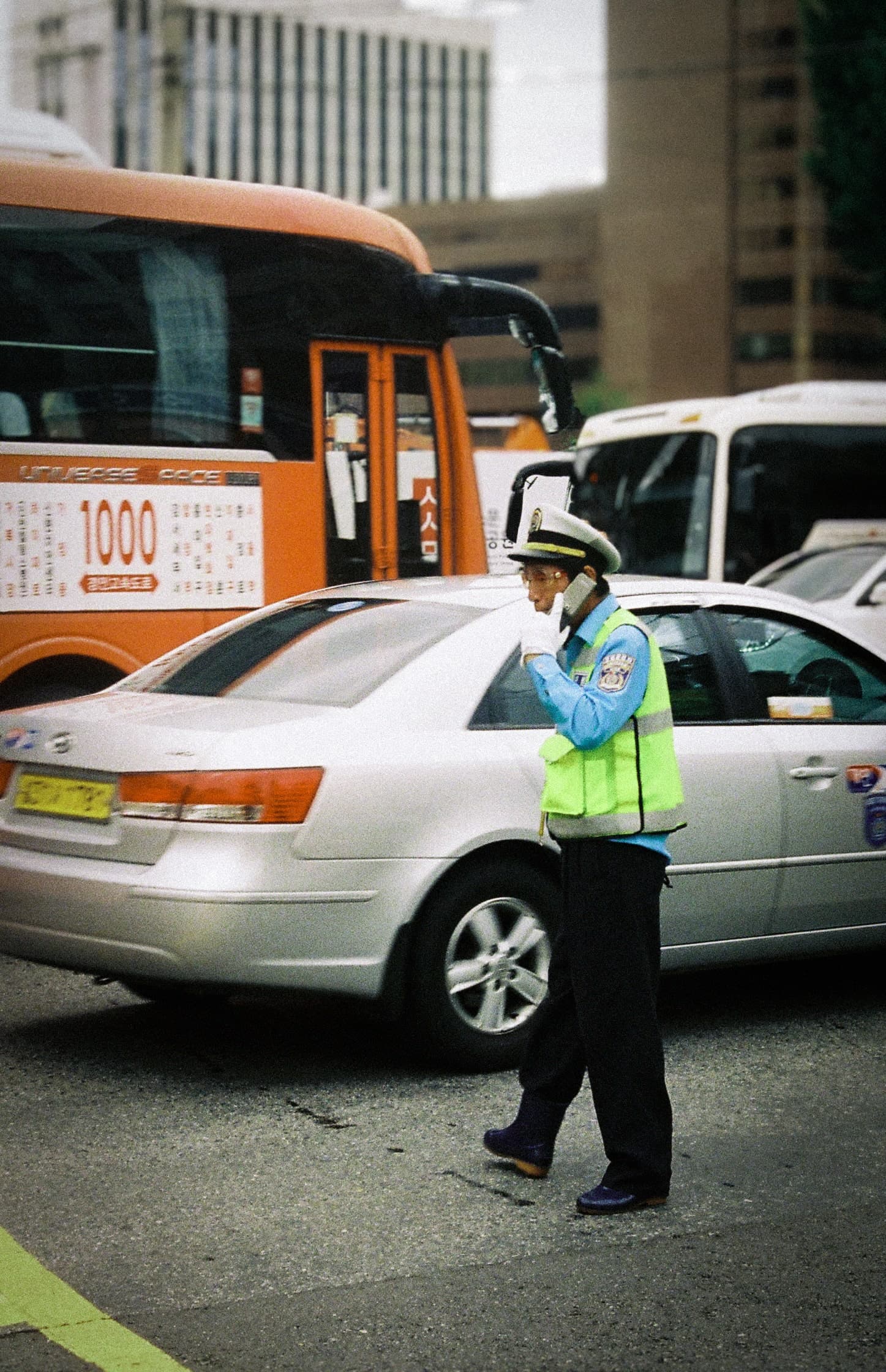 Le policier marche en plein milieu de la circulation embouteillée, téléphone collé à l'oreille, l'air nonchalant. Il lève le bras pour faire ralentir les voitures autour de lui, mais mis à part ce geste, semble imperturbable.
