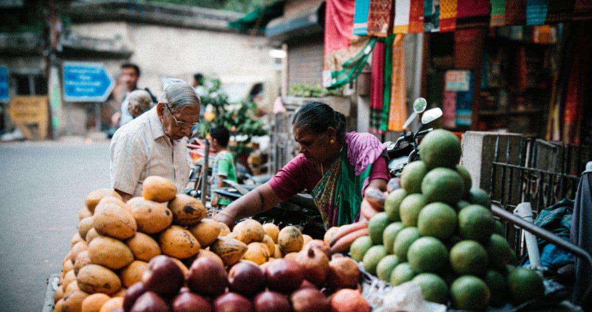 À voir cette photo, on a tout de suite envie de tâter ces fruits. De les sentir. De les croquer. Mais Guillaume Mougin, le photographe, n’a pas eu besoin d’y goûter pour avoir envie de les capturer. “Les trois couleurs m’ont sauté aux yeux”, se souvient-il. Orange, bordeaux, vert. Trois teintes qui ricochent, d’abord sur le sari de la vendeuse, puis sur les tissus suspendus, à l’arrière-plan.